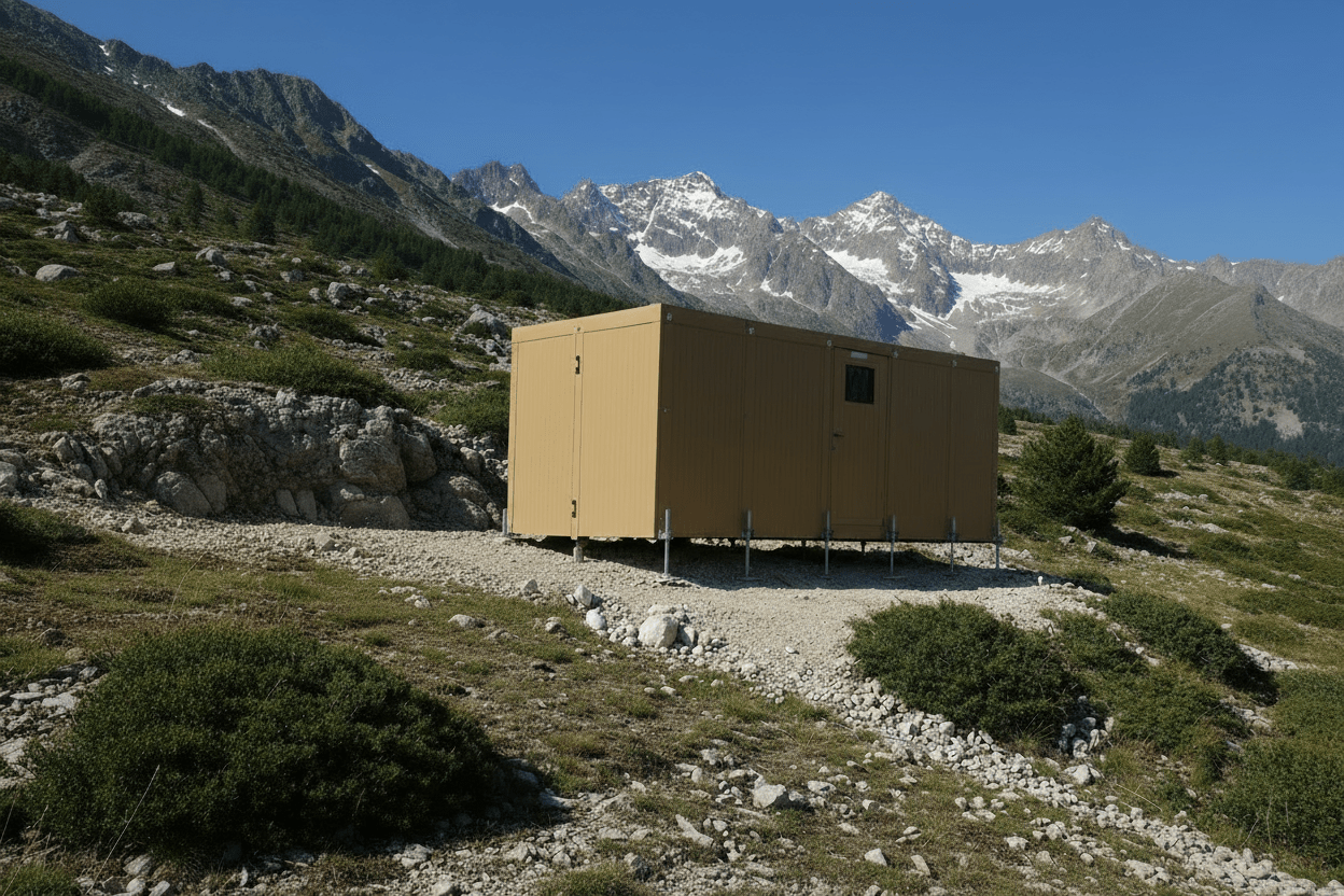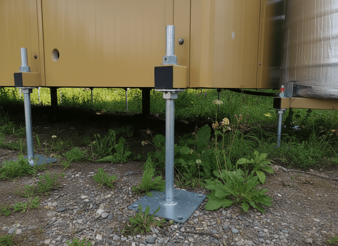 - Düz ve Eğimli zeminlerde kurulum: Ayarlanabilir ayak sistemi sayesinde, herhangi bir zemin tesviyesi, beton kaide veya altyapı hazırlığına ihtiyaç duyulmadan, engebeli ve kot farkı bulunan arazilerde dahi modülün milimetrik hassasiyetle teraziye (dengeye) alınması sağlanır.